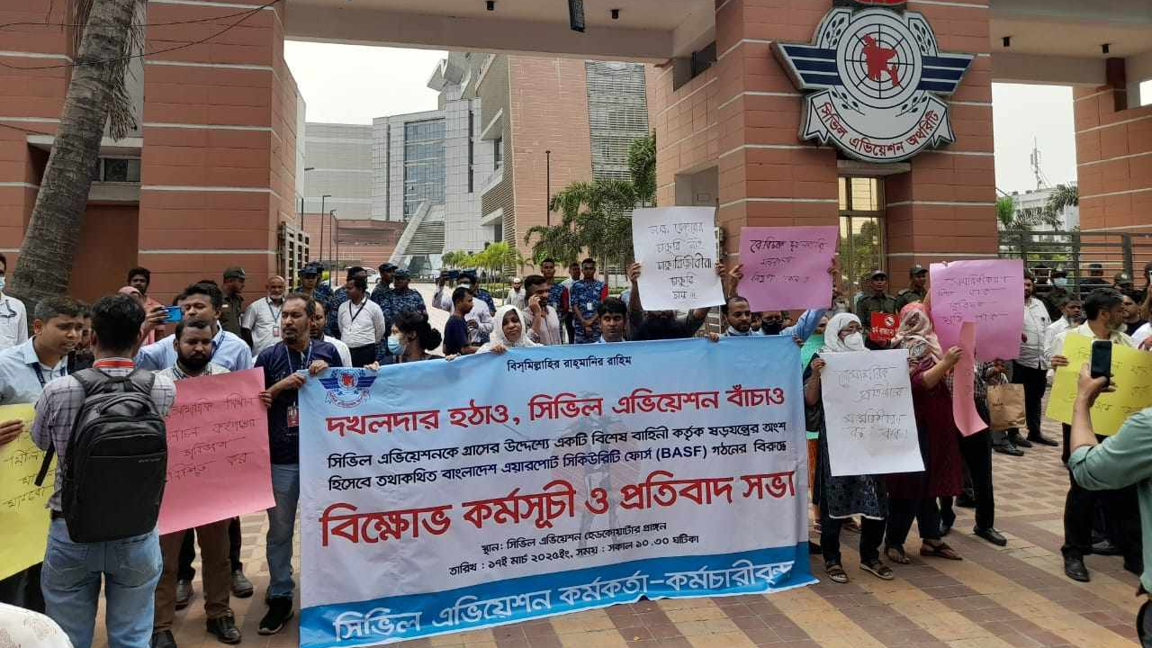 বাংলাদেশ এয়ারপোর্ট সিকিউরিটি ফোর্স গঠনের প্রস্তাব বাতিল ও বেসামরিক বিমান চলাচল কর্তৃপক্ষের (বেবিচক) এভিয়েশন সিকিউরিটি (এভসেক) বিভাগের স্বার্থ সংরক্ষণের দাবিতে বিক্ষোভ মিছিল করেছেন বেবিচকের কর্মকর্তা-কর্মচারীরা