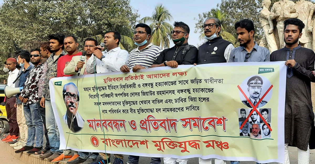 ঢাকা বিশ্ববিদ্যালয়ের (ঢাবি) ‘মুক্তিযোদ্ধা জিয়াউর রহমান হলের’ নাম পরিবর্তন করে বীর মুক্তিযোদ্ধা হল রাখাসহ তিন দাবিতে মানববন্ধন করেছে মুক্তিযুদ্ধ মঞ্চ।