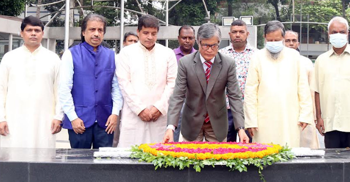 বঙ্গবন্ধুর প্রতিকৃতিতে অধ্যাপক সামাদের পুষ্পস্তবক অর্পণ