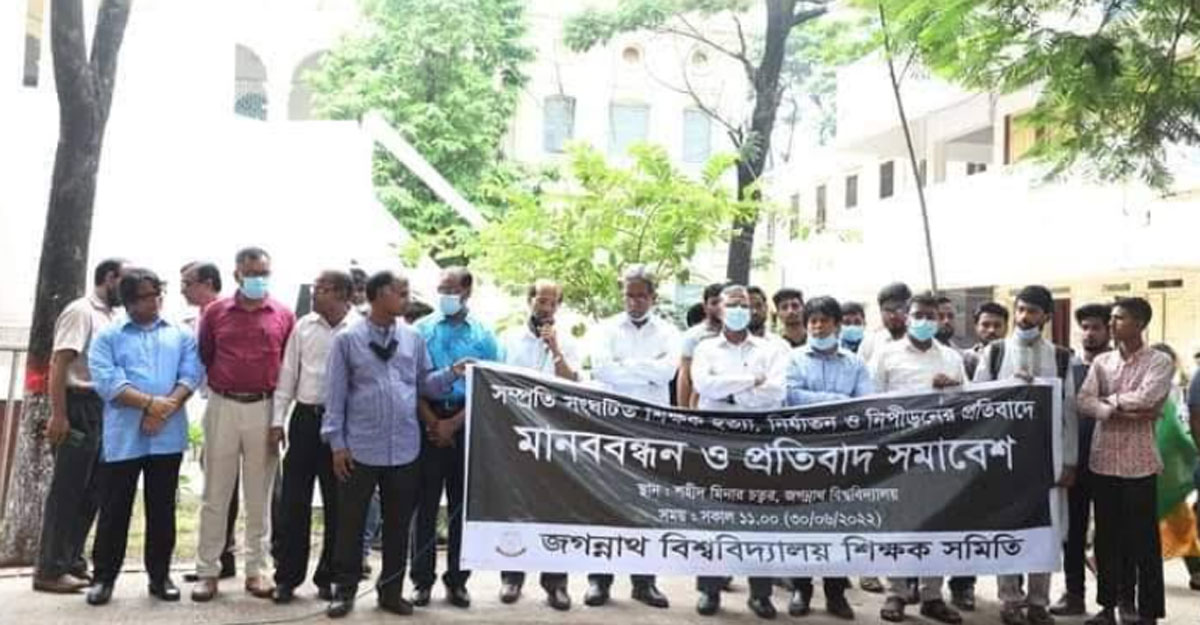 নড়াইলে মির্জাপুর ইউনাইটেড ডিগ্রী কলেজের অধ্যক্ষ স্বপন কুমার বিশ্বাসকে হেনস্তা, সাভারের আশুলিয়ায় কলেজ শিক্ষক উৎপল কুমার সরকারকে হত্যা এবং রাজশাহী বিশ্ববিদ্যালয়ের ইমেরিটাস অধ্যাপক ও পদার্থ বিজ্ঞানী ডক্টর অরুণ কুমারকে জমি সংক্রান্ত বিষয়ে হেনস্থা করায় তীব্র নিন্দা ও ক্ষোভ প্রকাশ করেছে জগন্নাথ বিশ্ববিদ্যালয় শিক্ষক সমিতি (জবিশিস)।