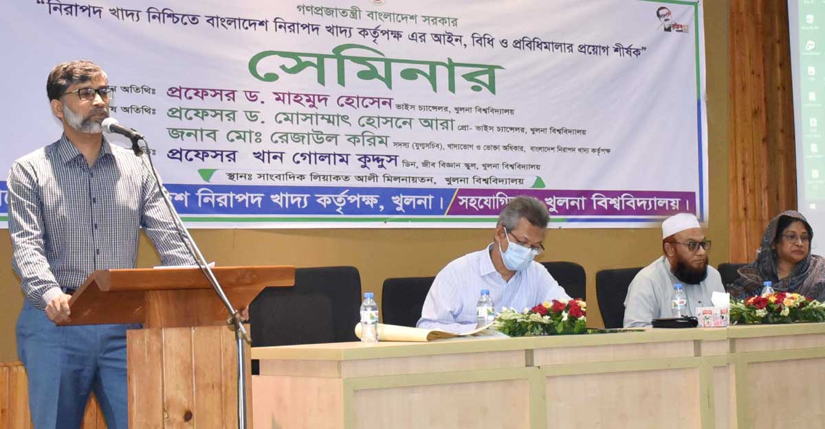 রোববার (৩১ জুলাই) সকাল ১০টায় বিশ্ববিদ্যালয়ের আচার্য জগদীশচন্দ্র বসু একাডেমিক ভবনের সাংবাদিক লিয়াকত আলী মিলনায়তনে অনুষ্ঠিত এক সেমিনারে প্রধান অতিথির বক্তব্যে তিনি এ কথা বলেন। বাংলাদেশ নিরাপদ খাদ্য কর্তৃপক্ষের আয়োজনে ও খুলনা বিশ্ববিদ্যালয়ের সহযোগিতায় ‘নিরাপদ খাদ্য নিশ্চিতে বাংলাদেশ নিরাপদ খাদ্য কর্তৃপক্ষ আইন, বিধি ও প্রবিধিমালার প্রয়োগ’ শীর্ষক এই সেমিনার অনুষ্ঠিত হয়।