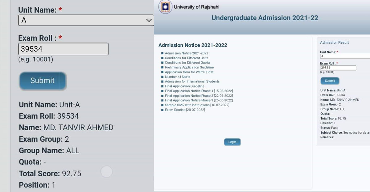 রাজশাহী বিশ্ববিদ্যালয়ের ২০২১-২২ সেশনের ভর্তি পরীক্ষায় এ ইউনিটের গ্রুপ-২ থেকে প্রথম হয়েছেন মু. তানভীর আহমেদ নামে এক ভর্তিচ্ছু। পরীক্ষায় ৯২.৭৫ নম্বর পেয়ে তিনি প্রথম স্থানে রয়েছে।