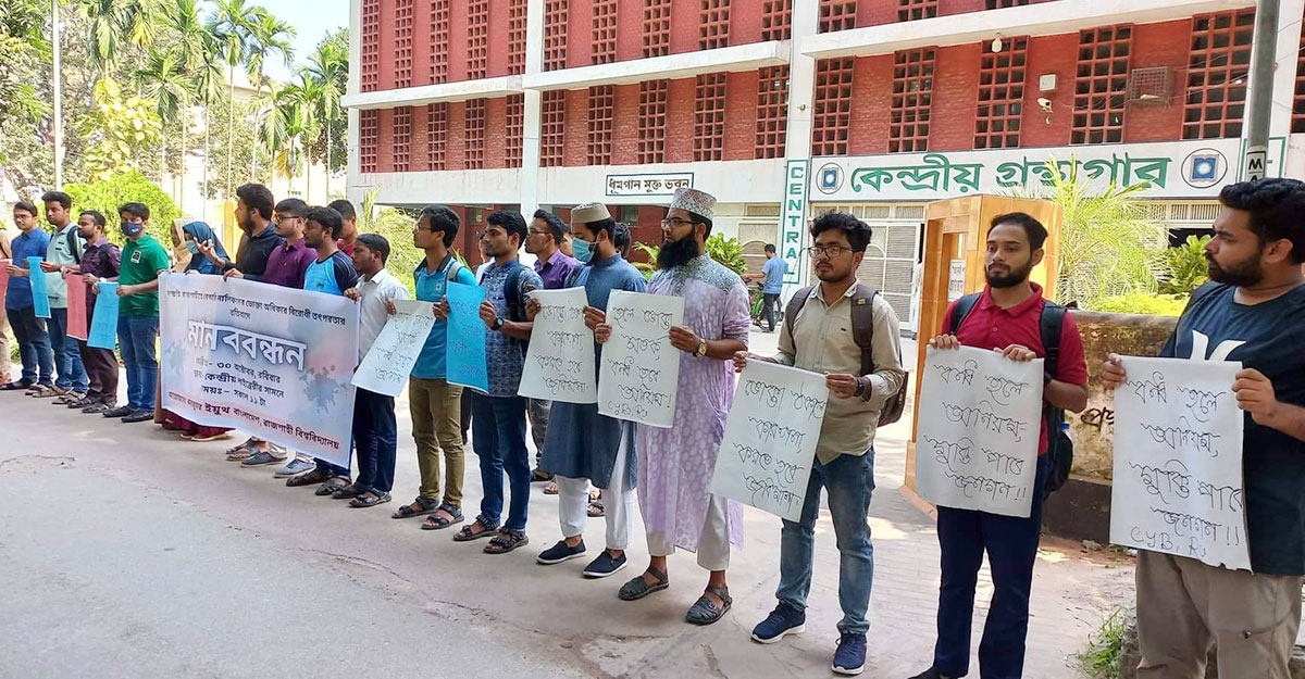 পরিসংখ্যান বিভাগের শিক্ষার্থী সাব্বির আহমেদের সঞ্চালনায় মানববন্ধনে আরও বক্তব্য প্রদান করেন আইন বিভাগের শিক্ষার্থী আল-আমিন হোসেন। মানববন্ধনে বিভিন্ন বিভাগের শিক্ষার্থীরা উপস্থিত ছিলেন।