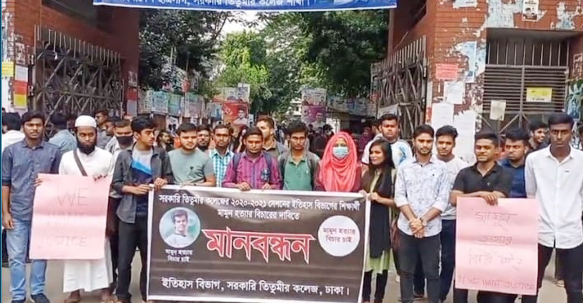 রাজধানীর সরকারি তিতুমীর কলেজের ছাত্র মামুন হত্যার বিচারের দাবিতে মানববন্ধন করেছেন সহপাঠী ও সাধারণ শিক্ষার্থীরা। বৃহস্পতিবার (৩ নভেম্বর) দুপুরে কলেজের প্রধান ফটকের সামনে এ কর্মসূচি পালন করা হয়েছে।