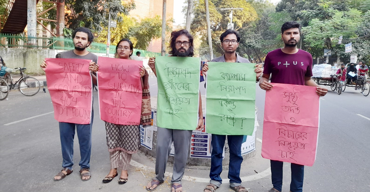 এ সময় শিক্ষার্থীরা, ‘ক্যাম্পাস নিরাপদ, কিন্তু রাষ্ট্র?’, ‘হাউ টু সারভাইভ ইন দিজ কান্ট্রি?’, ‘নিরাপদ জীবনের নিশ্চয়তা চাই’, ‘সুষ্ঠু তদন্ত ও বিচারের নিশ্চয়তা চাই’ ইত্যাদি লেখা প্ল্যাকার্ড হাতে দাঁড়ান।
