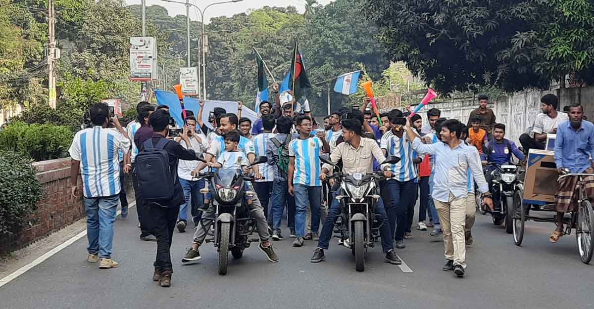 মঙ্গলবার (২২ নভেম্বর) দুপুর আড়াইটায় বিশ্ববিদ্যালয়ের সলিমুল্লাহ মুসলিম হল থেকে ব্যান্ড পার্টি সহকারে আনন্দ শোভাযাত্রা বের করেন আর্জেন্টিনা ফুটবল দলের সমর্থকরা। শোভাযাত্রাটি পুরো ক্যাম্পাস প্রদক্ষিণ করে।