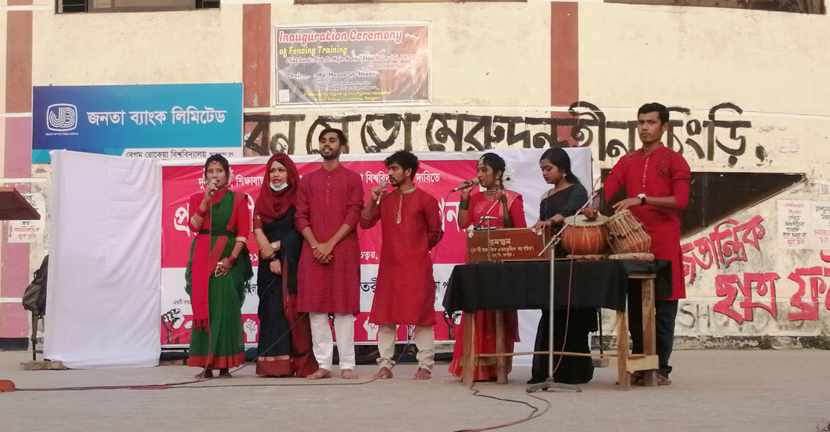 সঞ্চালনার ফাঁকে ফাঁকে প্রতিবাদী উচ্চারণ। অসঙ্গতি, অন্যায়, অনিয়ম, দুর্নীতি, সেশনজট শব্দগুলোকে ‘না’ বলে হাত উঁচিয়ে সমর্থন। আবার কখনো ‘ক্ষমা নেই ছিছি, ক্যাম্পাসে আসেন ভিসি-এরকম নানা স্লোগান। চলতে থাকে একটার পর একটা গান, নাচ আর আবৃত্তি। এভাবেই মহামান্য আচার্যের (রাষ্ট্রপতি) কাছে ইতিবাচক বেগম রোকেয়া বিশ্ববিদ্যালয়ের (বেরোবি) দাবি জানান বেরোবির সংস্কৃতিকর্মীরা।
