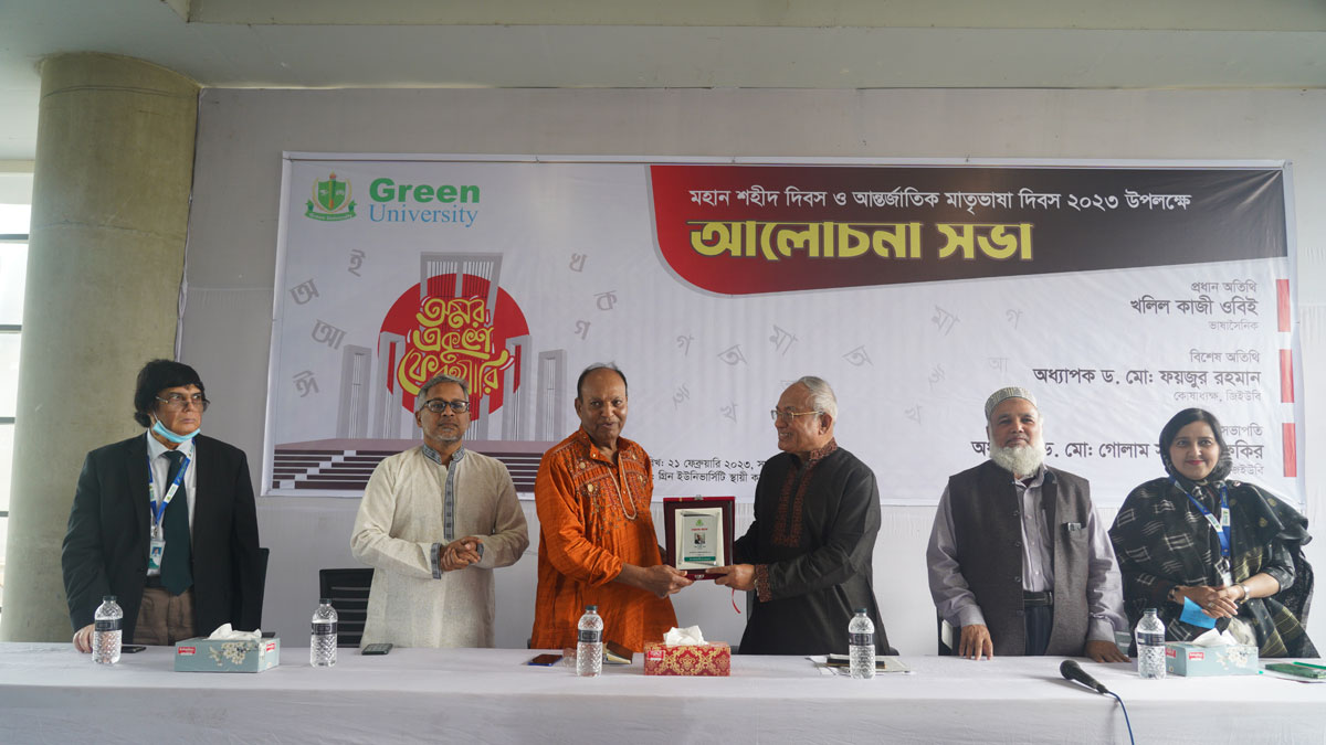 এদিন গ্রিন ইউনিভার্সিটির উপাচার্য অধ্যাপক ড. মো. গোলাম সামদানী ফকিরের সভাপতিত্বে এক আলোচনা সভার আয়োজন করা হয়। এতে বিশেষ অতিথি হিসেবে বক্তব্য রাখেন ভাষা সৈনিক খলিল কাজী ওবিই প্রধান অতিথি ও বিশ্ববিদ্যালয়ের কোষাধ্যক্ষ অধ্যাপক ড. মো. ফায়জুর রহমান।