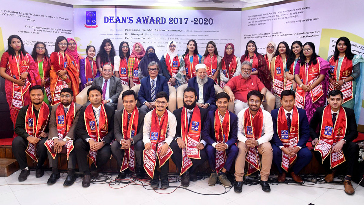 ২০১৭, ২০১৮, ২০১৯ এবং ২০২০ সালের স্নাতক (সম্মান) পরীক্ষায় সর্বোচ্চ সিজিপিএ লাভ করায় ঢাকা বিশ্ববিদ্যালয় (ঢাবি) সামাজিক বিজ্ঞান অনুষদভুক্ত বিভিন্ন বিভাগের ৩৬ জন মেধাবী শিক্ষার্থীকে 'ডিনস অ্যাওয়ার্ড' দেওয়া হয়েছে।