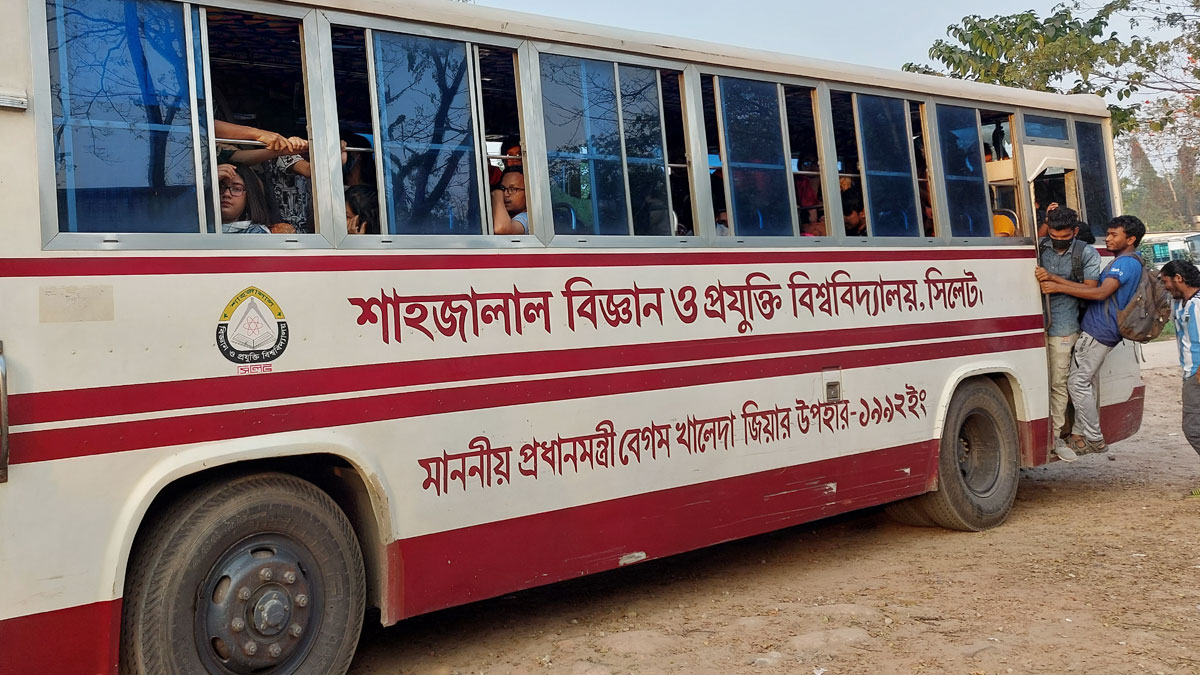 শাহজালাল বিজ্ঞান ও প্রযুক্তি বিশ্ববিদ্যালয়ে বাসের সংখ্যা কম থাকায় ভোগান্তিতে পড়েছেন শিক্ষার্থীরা। আসনের চেয়ে অতিরিক্ত শিক্ষার্থী নিয়েই চলাচল করছে বাসগুলো। প্রতিনিয়তই যেন ‘বাদুড়ঝোলা’ হয়ে গন্তব্যে পৌঁছাতে হয় শিক্ষার্থীদের। তবে এ নিয়ে প্রশাসনের কোনো কার্যকর পদক্ষেপ দেখা যায়নি।
