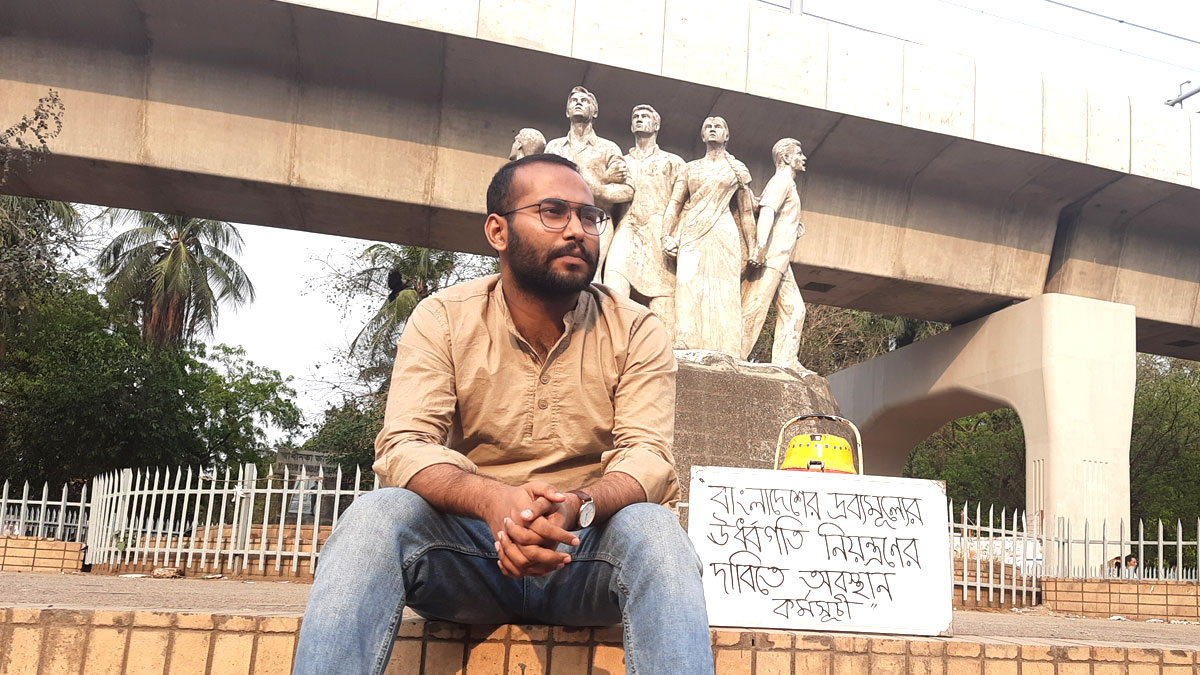 দ্রব্যমূল্যের ঊর্ধ্বগতি নিয়ন্ত্রণের দাবি জানিয়ে একক অবস্থান কর্মসূচি শুরু করেছেন বাংলাদেশ রেলওয়ের অনিয়ম, দুর্নীতি ও অব্যবস্থাপনার প্রতিবাদে আন্দোলন করা ঢাকা বিশ্ববিদ্যালয়ের শিক্ষার্থী মহিউদ্দিন রনি।