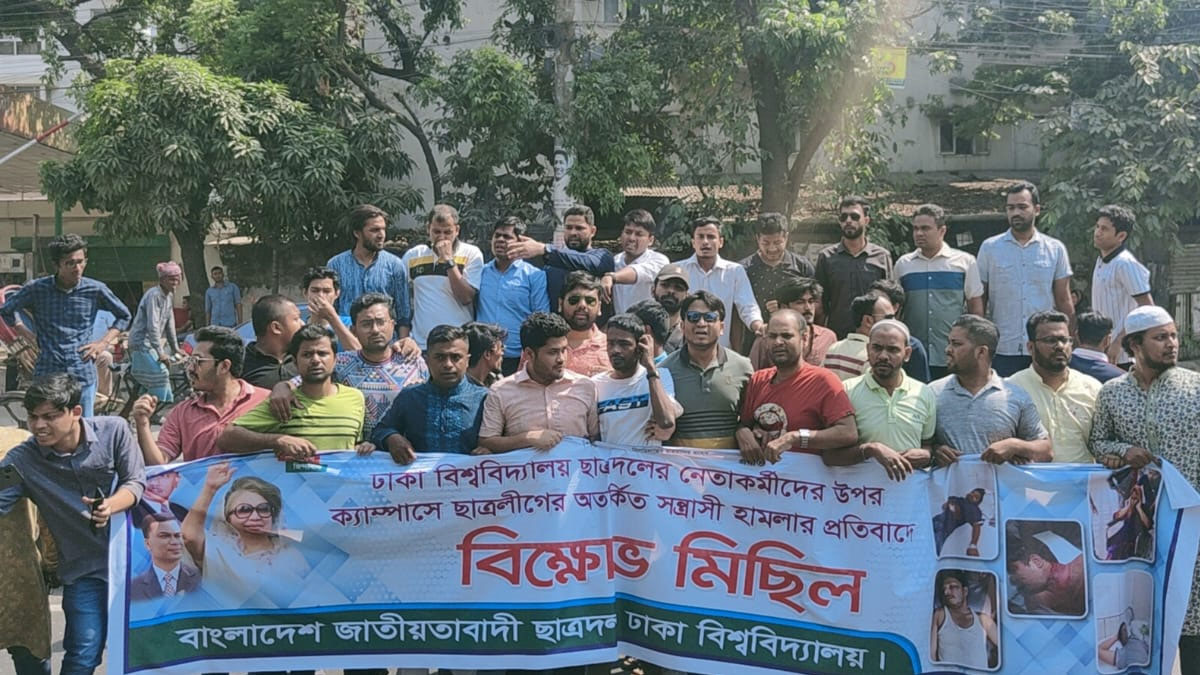 ঢাকা বিশ্ববিদ্যালয় ক্যাম্পাসে নেতাকর্মীদের ওপর ছাত্রলীগের অতর্কিত হামলার প্রতিবাদে বিক্ষোভ মিছিল ও সমাবেশ করেছে বিশ্ববিদ্যালয় ছাত্রদল।