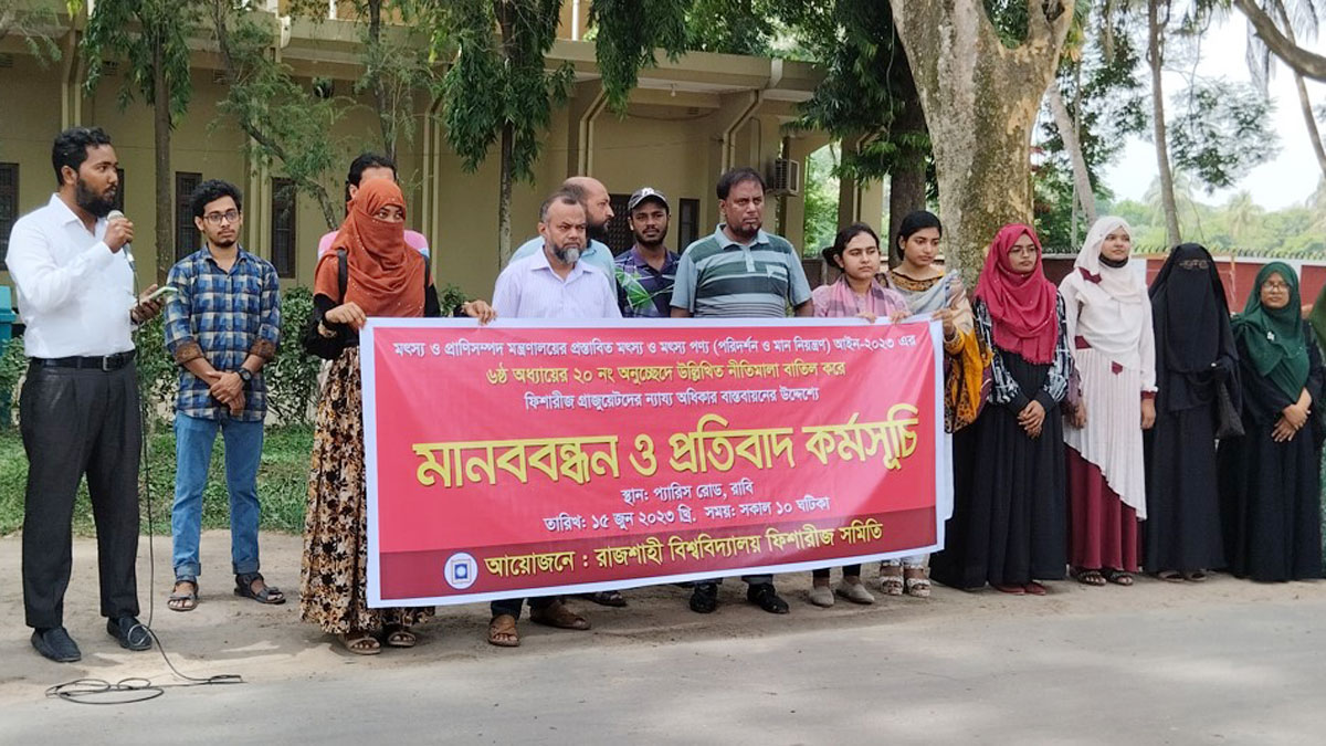 মৎস্য ও প্রাণিসম্পদ মন্ত্রণালয়ের প্রস্তাবিত নতুন প্রজ্ঞাপনের ষষ্ঠ অধ্যায়ের ২০ নম্বর অনুচ্ছেদে উল্লিখিত নীতিমালা বাতিল করে ফিশারিজ গ্র্যাজুয়েটদের ন্যায্য অধিকার বাস্তবায়ন করার দাবিতে মানববন্ধন ও প্রতিবাদ সমাবেশ করেছে রাজশাহী বিশ্ববিদ্যালয় ফিশারিজ সমিতি।