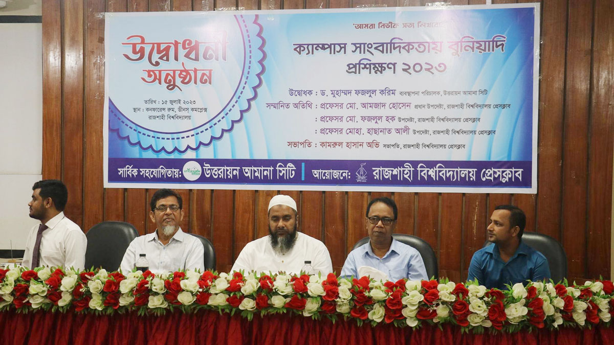 রাজশাহী বিশ্ববিদ্যালয় (রাবি) প্রেসক্লাব আয়োজিত ‘ক্যাম্পাস সাংবাদিকতায় বুনিয়াদি প্রশিক্ষণ’ শীর্ষক দুই দিনব্যাপী এক কর্মশালা শুরু হয়েছে। এতে বিশ্ববিদ্যালয়ের তিনটি সাংবাদিক সংগঠন ও রাজশাহী কলেজ থেকে মোট ৪৫ জন ক্যাম্পাস সাংবাদিক অংশ নেন।