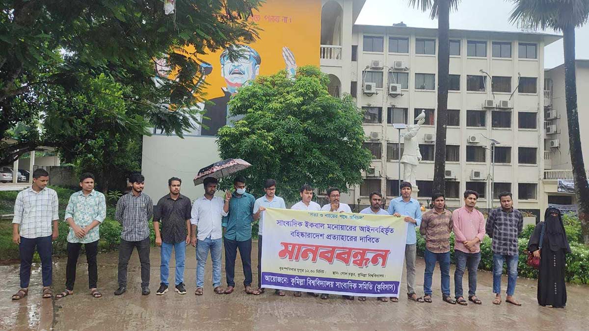 বৃহস্পতিবার (৩ আগস্ট) দুপুরে কুমিল্লা বিশ্ববিদ্যালয় গোলচত্বরে মানববন্ধনে এ দাবি জানানো হয়। মানববন্ধনের আয়োজন করে কুমিল্লা বিশ্ববিদ্যালয় সাংবাদিক সমিতি (কুবিসাস)
