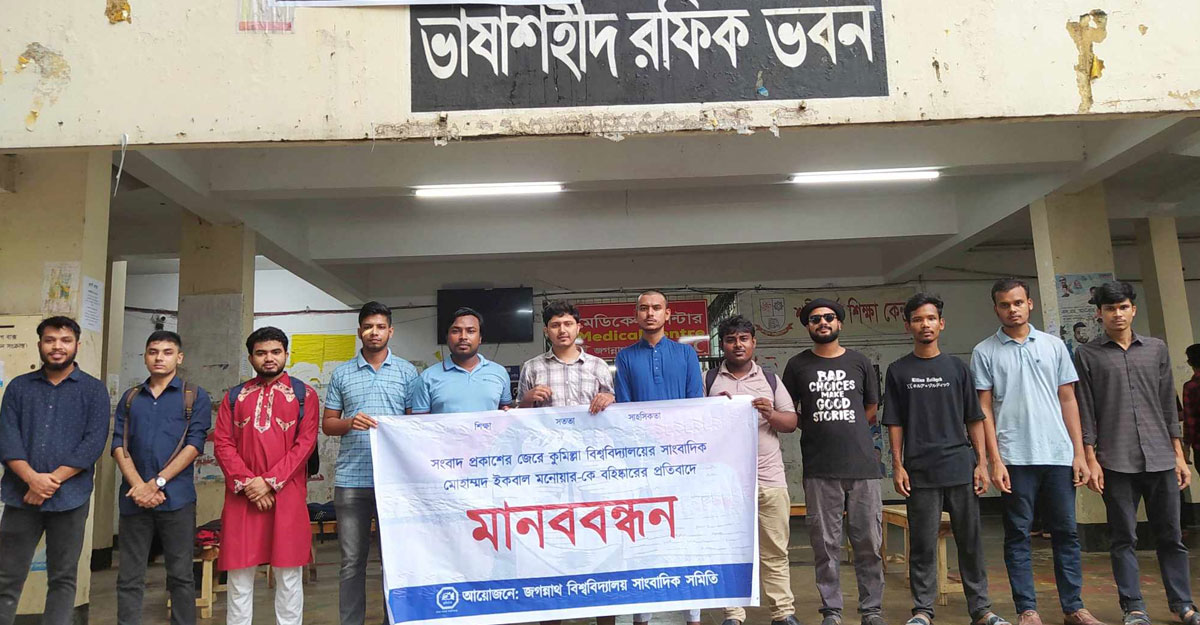 কুমিল্লা বিশ্ববিদ্যালয় সাংবাদিক সমিতির (কুবিসাস) অর্থ সম্পাদক ও দৈনিক যায়যায়দিনের প্রতিনিধি রুদ্র ইকবালের বহিষ্কারাদেশ প্রত্যাহারের দাবিতে মানববন্ধন কর্মসূচি পালন করেছে জগন্নাথ বিশ্ববিদ্যালয় সাংবাদিক সমিতির (জবিসাস) সদস্যরা।