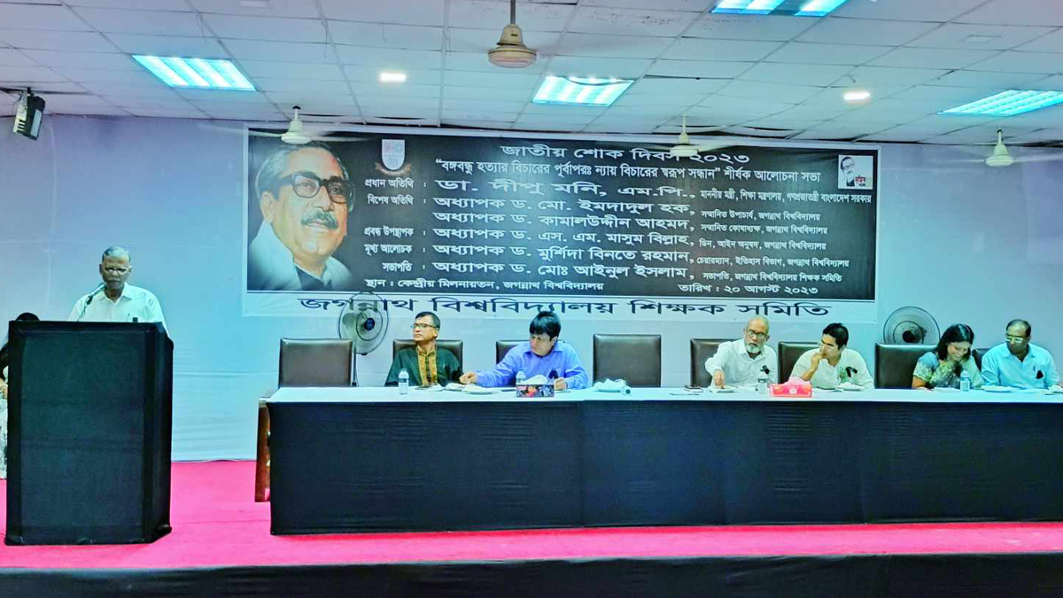 অনুষ্ঠানে সভাপতির বক্তব্যে শিক্ষক সমিতির সভাপতি অধ্যাপক আইনুল ইসলাম, বিশ্ববিদ্যালয়ে খুব শ্রীঘই বঙ্গবন্ধু চেয়ার প্রতিস্থাপনের দাবি জানান৷ তিনি বলেন, নতুন প্রজন্মকে বঙ্গবন্ধু হত্যার পূর্বাপর এবং এ হত্যার প্রকৃত বিচারের জন্য একটি কমিশন গঠনের প্রস্তাব করা হয়।
