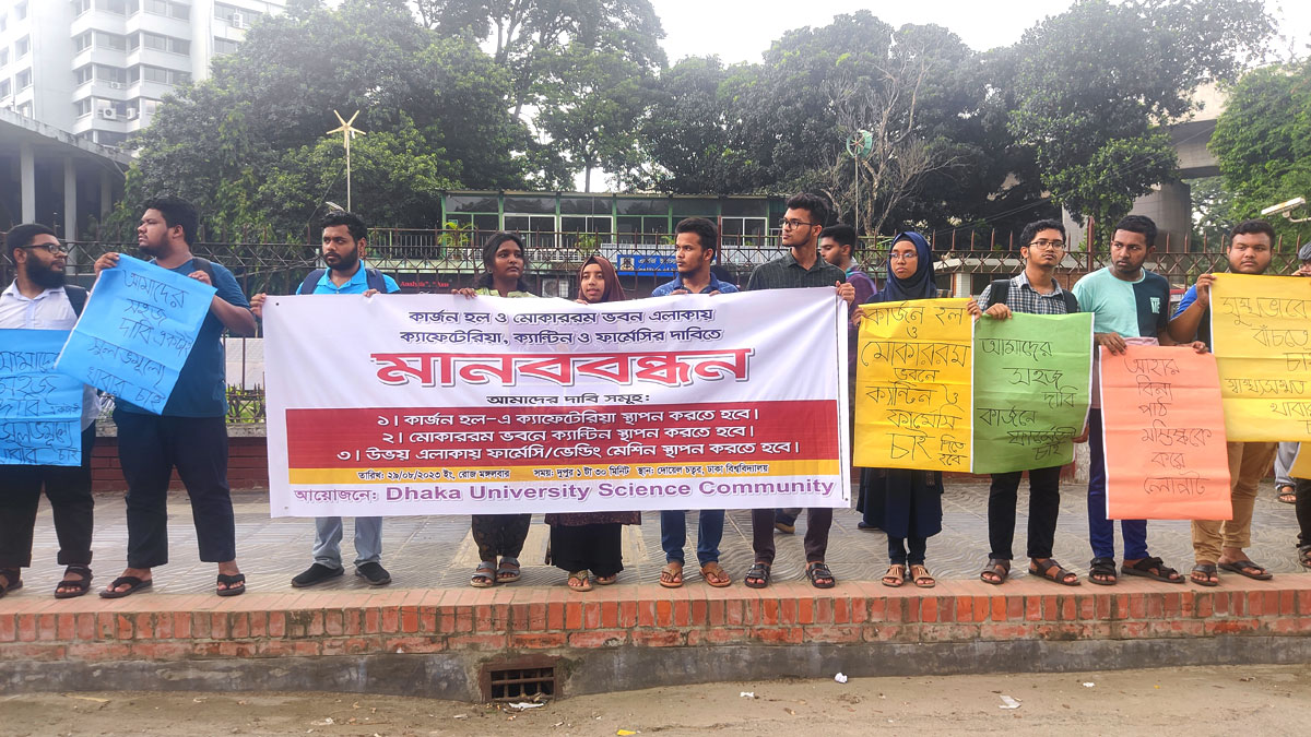 এসময় মানববন্ধনের বিভিন্ন বিভাগের প্রায় শতাধিক শিক্ষার্থী উপস্থিত ছিলেন। এর আগে, কার্জন হলে ক্যাফেটেরিয়া, ফার্মেসি/ভ্যান্ডিং মেশিন এবং মোকাররম ভবনে ক্যান্টিন স্থাপনের দাবিতে লিফলেট বিতরণসহ সামাজিক যোগাযোগ মাধ্যমে প্রচারণা চালান সাইন্সের শিক্ষার্থীরা।