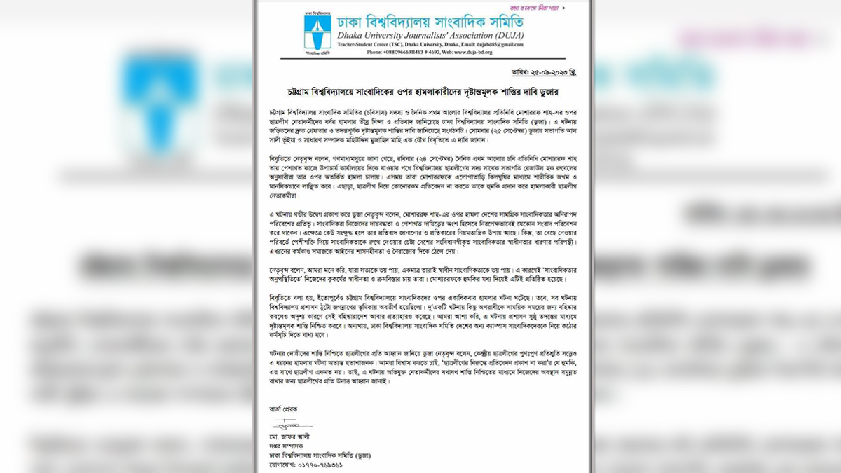 চট্টগ্রাম বিশ্ববিদ্যালয় সাংবাদিক সমিতির (চবিসাস) সদস্য ও দৈনিক প্রথম আলোর বিশ্ববিদ্যালয় প্রতিনিধি মোশাররফ শাহ-এর ওপর ছাত্রলীগ নেতাকর্মীদের বর্বর হামলার তীব্র নিন্দা ও প্রতিবাদ জানিয়েছে ঢাকা বিশ্ববিদ্যালয় সাংবাদিক সমিতি (ডুজা)। এ ঘটনায় জড়িতদের দ্রুত গ্রেপ্তার ও তদন্তপূর্বক দৃষ্টান্তমূলক শাস্তির দাবি জানিয়েছে সংগঠনটি।
