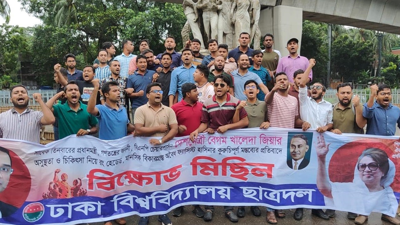 সাধারণ সম্পাদক আরিফুল ইসলাম বলেন, সাবেক তিনবারের প্রধানমন্ত্রী বিএনপির চেয়ারপার্সন বেগম খালেদা জিয়ার অসুস্থতা ও চিকিৎসা নিয়ে শেখ হাসিনার মন্তব্যের প্রতি ঢাবি ছাত্রদল ধিক্কার জানায়। শেখ হাসিনা জনগণ থেকে উপেক্ষিত হয়ে ক্ষমতা হারানোর ভয়ে উন্মাদ হয়ে গেছে, আবোল তাবোল বকছে। এজন্য তার চিকিৎসা প্রয়োজন।