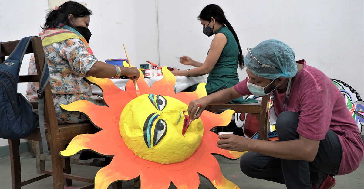 কেউ মুখোশ তৈরি করছেন, কেউ তাতে রঙের তুলি বোলাচ্ছেন। আবার কেউ কেউ চারুকলার সামনের দেয়ালে আঁকছেন নানা ছবি। সেখানে তরুণ চিত্রশিল্পীরা আবহমান বাংলার সংস্কৃতি, ইতিহাস, ঐতিহ্য ও উৎসবের নানা দিক তুলে ধরছেন।