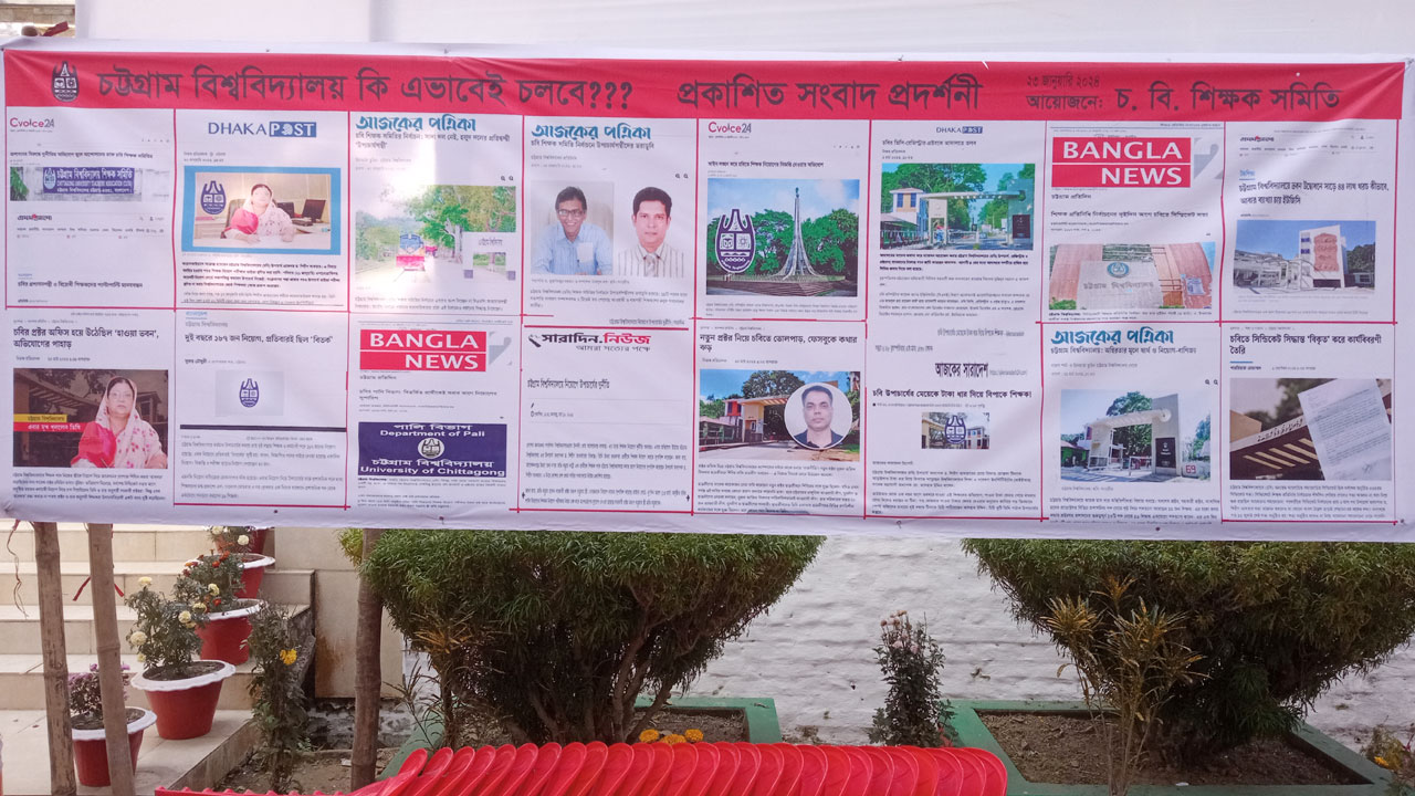 অনিয়ম ও দুর্নীতির অভিযোগে চট্টগ্রাম বিশ্ববিদ্যালয়ের (চবি) উপাচার্য ও উপ-উপাচার্যের পদত্যাগ দাবিতে বিভিন্ন সময় পত্রিকায় প্রকাশিত সংবাদ প্রদর্শনীর আয়োজন করেছে চবি শিক্ষক সমিতি। মঙ্গলবার (২৩ জানুয়ারি) বিকেল ৩টার দিকে বিশ্ববিদ্যালয়ের প্রশাসনিক ভবনের সামনে বঙ্গবন্ধু চত্বরে তিনদিন ব্যাপী এ প্রদর্শনীর আয়োজন করা হয়।