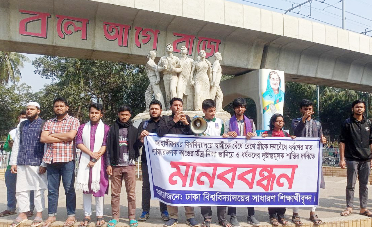 রোববার (৪ ফেব্রুয়ারি) দুপুর ২টায় বিশ্ববিদ্যালয়ের সন্ত্রাস বিরোধী রাজু ভাস্কর্যের পাদদেশে সাধারণ শিক্ষার্থীদের ব্যানারে এই মানববন্ধনের আয়োজন করা হয়।