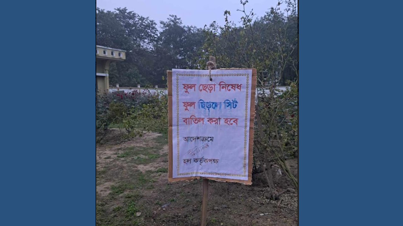 ইসলামী বিশ্ববিদ্যালয়ের (ইবি) দেশরত্ন শেখ হাসিনা হলের বাগানে ‘ফুল ছিঁড়লেই হলে সিট বাতিল করা হবে’ এমনই পোস্টার টানিয়েছেন হল কর্তৃপক্ষ। হলটির ফুলের বাগানের বিভিন্ন জায়গায় একাধিক প্ল্যাকার্ডে এই সতর্কবার্তা সাঁটানো হয়েছে।