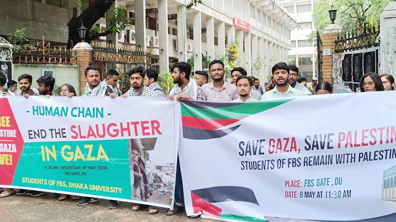 ফিলিস্তিনের গাজায় ইসরায়েলি বাহিনীর বর্বরোচিত হামলার প্রতিবাদ ও ফিলিস্তিনের স্বাধীনতার দাবিতে মানববন্ধন করেছে ঢাকা বিশ্ববিদ্যালয়ের ব্যবসায় শিক্ষা অনুষদের শিক্ষার্থীরা।