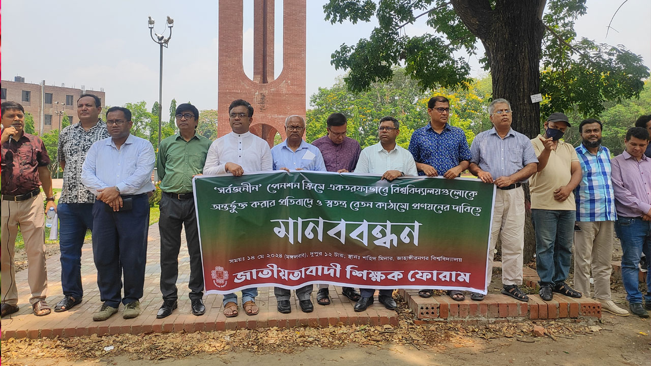 সর্বজনীন পেনশন সংক্রান্ত প্রজ্ঞাপন বাতিল ও বিশ্ববিদ্যালয় শিক্ষকদের জন্য স্বতন্ত্র বেতন কাঠামো প্রণয়নের দাবিতে মানববন্ধন করেছেন জাহাঙ্গীরনগর বিশ্ববিদ্যালয়ের (জাবি) বিএনপি পন্থি শিক্ষকরা।