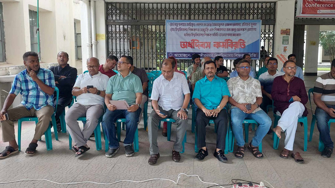 বিবৃতিতে বলা হয়, অর্থ মন্ত্রণালয়ের জারিকৃত পেনশন সংক্রান্ত বৈষম্যমূলক প্রজ্ঞাপন প্রত্যাহার, সুপার গ্রেড বিশ্ববিদ্যালয় শিক্ষকদের অন্তর্ভুক্তি এবং বিশ্ববিদ্যালয়ের শিক্ষকদের স্বতন্ত্র বেতন কাঠামো প্রবর্তনের দাবিতে ২৫, ২৬, ও ২৭ জুন অর্ধ দিবস কর্মবিরতি পালন করা হবে। তবে এ সময় পরীক্ষা সমূহ কর্মবিরতির আওতামুক্ত থাকবে। আগামী ৩০ জুন পূর্ণ দিবস কর্ম বিরতি পালন করা হবে। এদিনও পরীক্ষা সমূহ কর্মবিরতির আওতামুক্ত থাকবে। তবে ১ জুলাই থেকে দাবি আদায় না হওয়া পর্যন্ত সর্বাত্মক কর্মবিরতি পালন করা হবে।