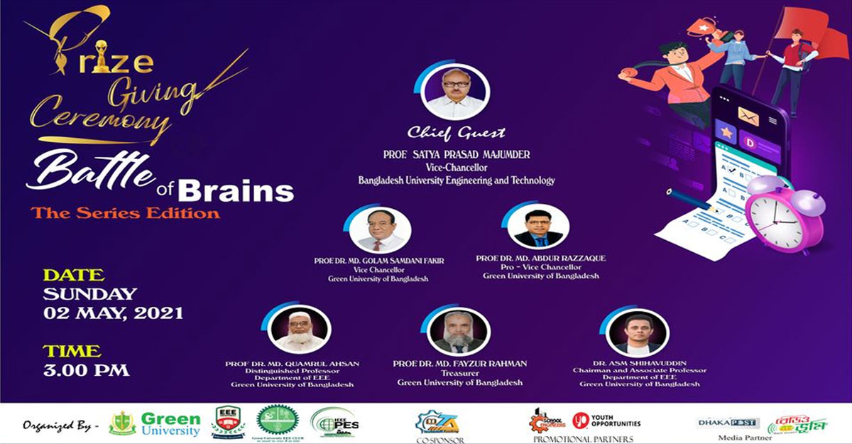 বিশ্ববিদ্যালয়, কলেজ ও পলিটেকনিক প্রতিষ্ঠানের তিন হাজার শিক্ষার্থীর অংশগ্রহণে আয়োজিত অনলাইনভিত্তিক বৃহৎ কুইজ প্রতিযোগিতা ‘ব্যাটল অব ব্রেইনস-দ্য সিরিজ এডিশন’-এর পুরস্কার বিতরণী অনুষ্ঠিত হয়েছে। গ্রিন ইউনিভার্সিটির ইলেক্ট্রিক্যাল অ্যান্ড ইলেক্ট্রনিক ইঞ্জিনিয়ারিং (ইইই) বিভাগ রোববার (২ মে) এই অনুষ্ঠানের আয়োজন করে।