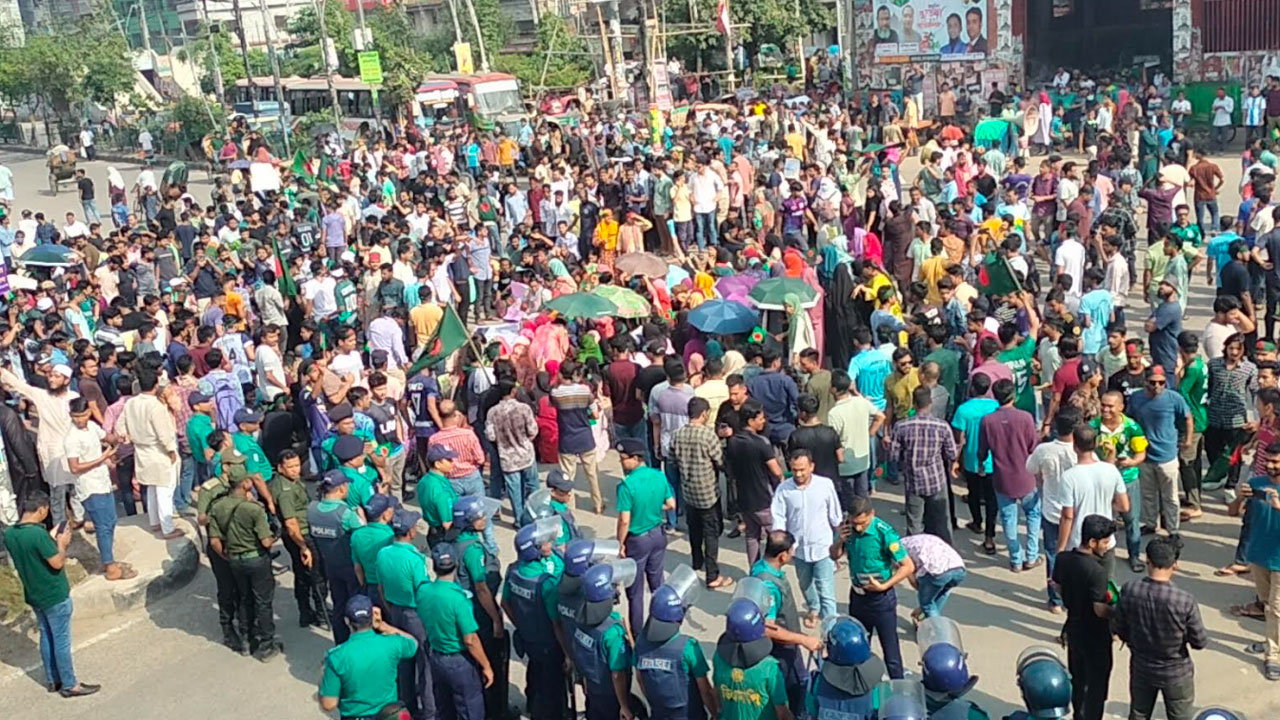 পুলিশি বাধায় তাঁতীবাজারে অবস্থান জবি শিক্ষার্থীদের