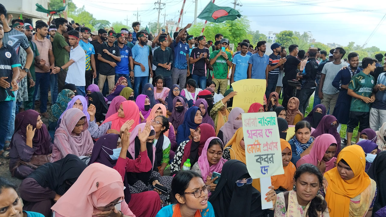 বিক্ষোভ সমাবেশে শিক্ষার্থীরা ‘এই কোটা সেই কোটা মারে তিলে তিলে, বাবার কোটা, দাদার কোটা আরো কোটা নিজে, চাকরিবাকরি করবো ক্যামনে আমার কোটা নাইরে। খেয়ে যায় আমার চাকরি খেয়ে যায় কোটায় মারা খেয়ে যাইরে।’
