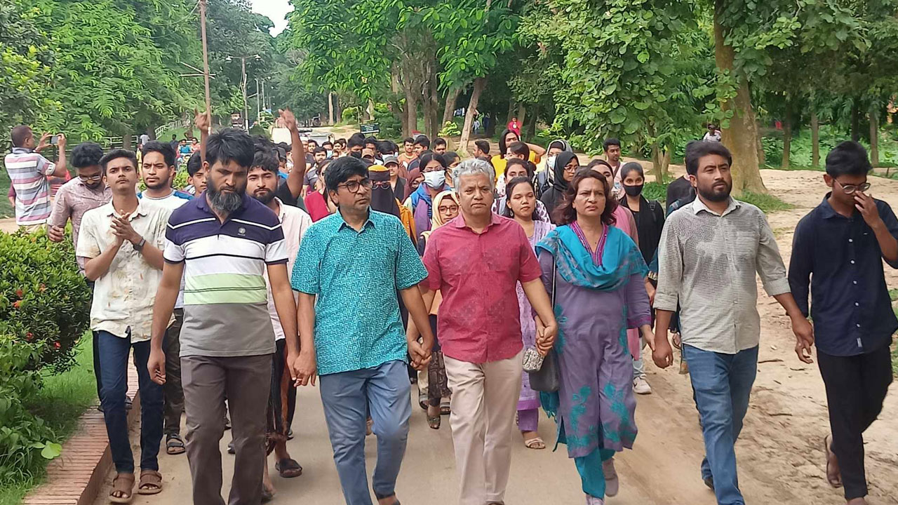 এদিকে শিক্ষার্থীদের আন্দোলনে সংহতি জানিয়ে বিশ্ববিদ্যালয়ের বিভিন্ন বিভাগের শিক্ষকরা বিক্ষোভ মিছিলে অংশ নেন। তারা হলেন- বিশ্ববিদ্যালয়ের ফার্মেসি বিভাগের অধ্যাপক মোহাম্মদ মাফরুহী সাত্তার, ইতিহাস বিভাগের অধ্যাপক মোহাম্মদ গোলাম রব্বানী, বাংলা বিভাগের অধ্যাপক শামীমা সুলতানা, পরিবেশবিজ্ঞান বিভাগের অধ্যাপক জামাল উদ্দিন, ভূগোল ও পরিবেশ বিভাগের সহযোগী অধ্যাপক মোহাম্মদ রেজাউল রকিব প্রমুখ।