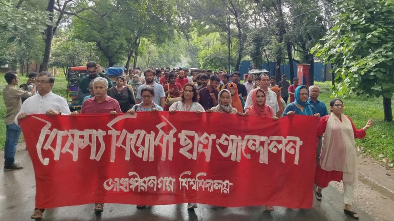 বৈষম্যবিরোধী ছাত্র আন্দোলনের জাবি শাখার সমন্বয়ক আব্দুর রশিদ জিতু বলেন, যৌক্তিক ও ন্যায্য দাবি আদায়ে আন্দোলনরত শিক্ষার্থীদের সঙ্গে গতকাল (বুধবার) ঢাকা বিশ্ববিদ্যালয়ের দুইজন শিক্ষিকাকে পুলিশ লাঞ্ছিত করেছে। চট্টগ্রাম বিশ্ববিদ্যালয়ে এক শিক্ষকের বাসভবনে বোমা হামলা হয়েছে। বেসরকারি ড্যাফোডিল বিশ্ববিদ্যালয়ের কিছু শিক্ষকে ওপর হামলার ঘটনা ঘটেছে। এ সকল ঘটনার তীব্র নিন্দা জানাচ্ছি।