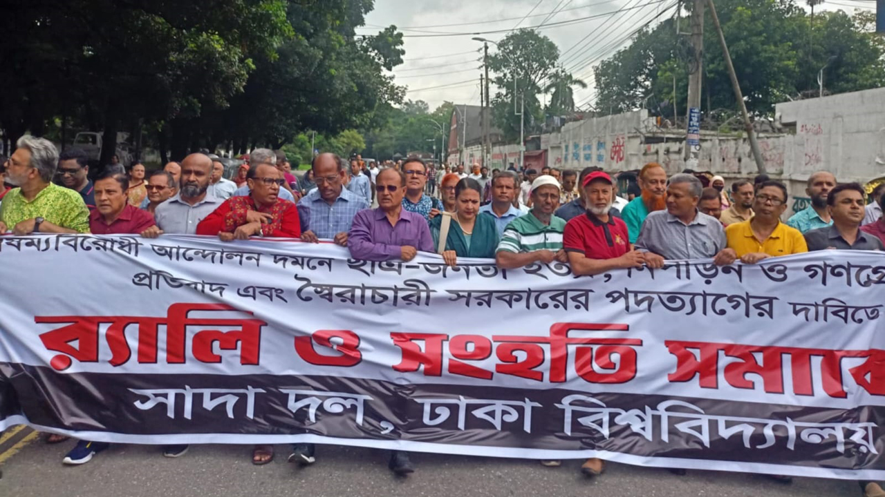 বৈষম্যবিরোধী আন্দোলন দমনে ছাত্র-জনতা হত্যা, নির্যাতন এবং গণগ্রেপ্তারের প্রতিবাদ এবং শেখ হাসিনার পদত্যাগ চেয়ে র্যালি ও সংহতি সমাবেশ করেছে ঢাকা বিশ্ববিদ্যালয়ের বিএনপিপন্থি শিক্ষকদের সংগঠন সাদা দল।