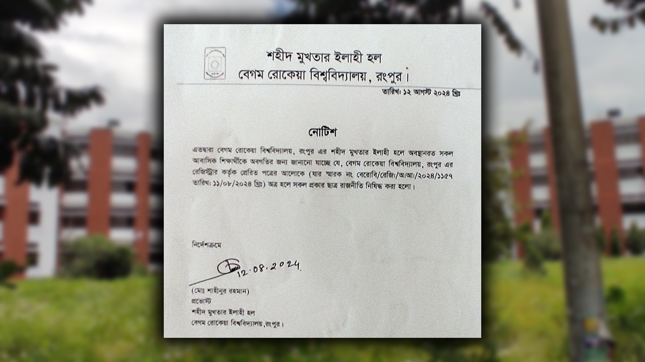 বিজ্ঞপ্তিতে বলা হয়, বেগম রোকেয়া বিশ্ববিদ্যালয়ের শহীদ মুখতার ইলাহী হলে অবস্থানরত সকল আবাসিক শিক্ষার্থীকে অবগতির জন্য জানানো যাচ্ছে যে, বিশ্ববিদ্যালয়ের রেজিস্ট্রার কতৃক প্রেরিত পত্রের আলোকে ১১ আগস্ট, ২০২৪ থেকে হলে সকল প্রকার রাজনীতি নিষিদ্ধ করা হলো।