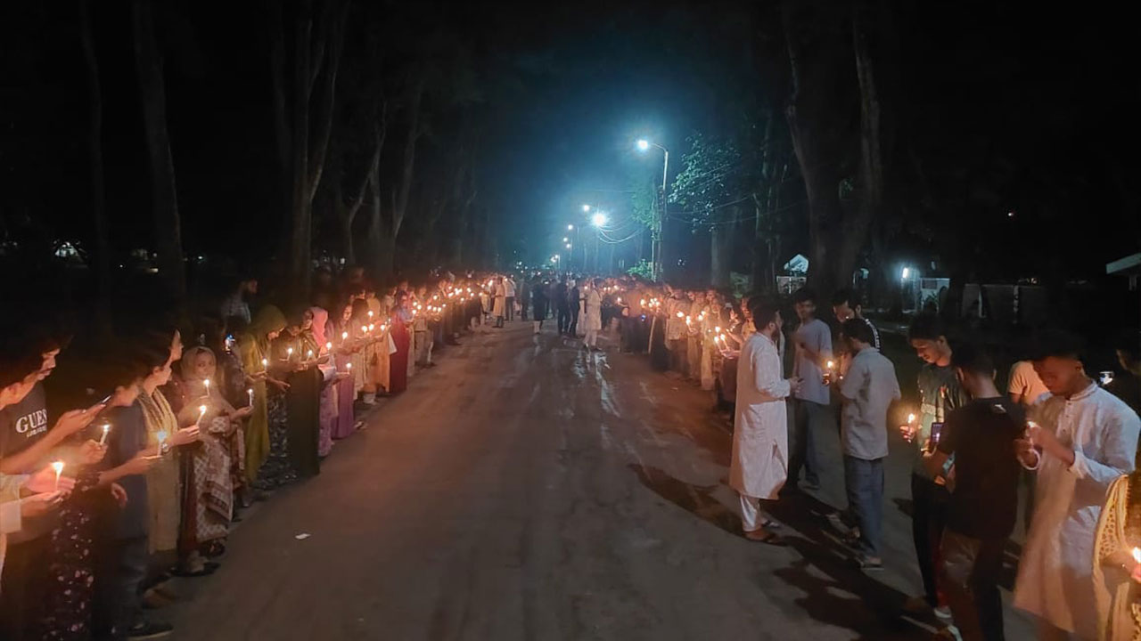 শুক্রবার (১৬ আগস্ট) রাতে সাড়ে ৭টায় বিশ্ববিদ্যালয়ের প্যারিস রোডে মোমবাতি হাতে এ কর্মসূচি করেন তারা। এসময় নিহতের জন্য এক মিনিট নিরবতা পালন করেন শিক্ষার্থীরা।