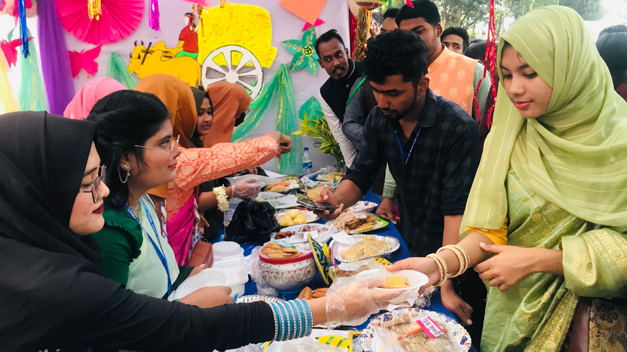সায়মা সুলতানা মাইশা নামের এক শিক্ষার্থী জানান, ৩৫-৪০ রকমের পিঠা দিয়ে আমাদের স্টলটাকে সাজানো হয়েছে। এসব পিঠার দাম রাখা হচ্ছে ১০-৪০ টাকা পর্যন্ত। ঘণ্টা দুয়েকের মধ্যে আমাদের প্রায় পিঠা বিক্রি হয়ে গেছে। বিভিন্ন শিক্ষার্থীরা এসে খুবই আনন্দের সঙ্গে এসব পিঠা কিনেছেন।