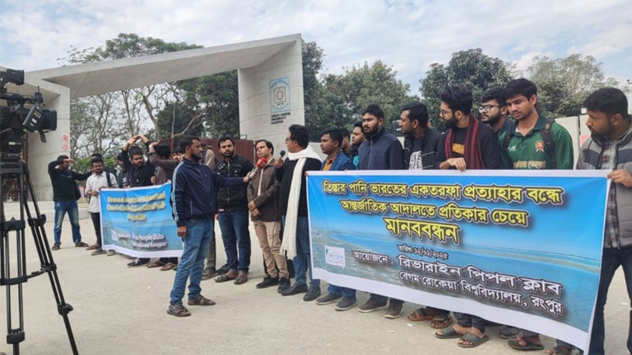 তিস্তার পানি ভারতের একতরফা প্রত্যাহার বন্ধে আন্তর্জাতিক আদালতে প্রতিকার চেয়ে রংপুরে মানববন্ধন ও সমাবেশ করেছে বেগম রোকেয়া বিশ্ববিদ্যালয়ের রিভারাইন পিপল ক্লাব।