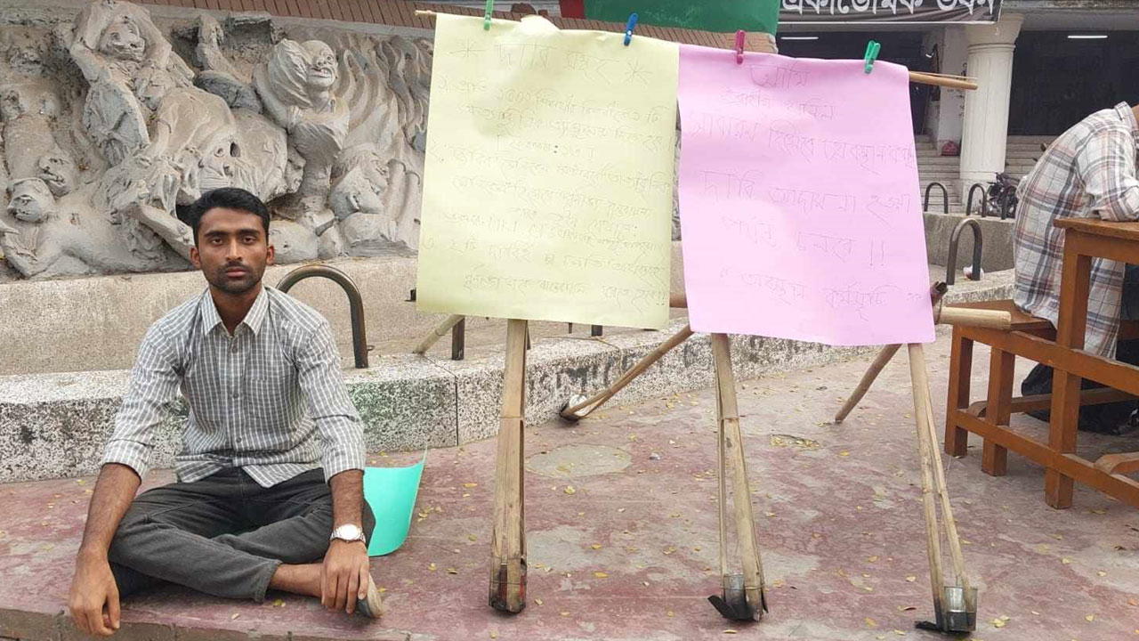 আজ (মঙ্গলবার) দুপুরে বিশ্ববিদ্যালয়ের ভাস্কর্য চত্বরে প্ল্যাকার্ড নিয়ে অবস্থান কর্মসূচিতে বসে পড়েন এই শিক্ষার্থী।