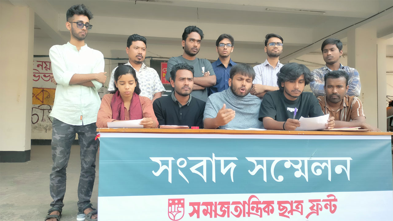 শিক্ষক নিয়োগে ডেমো ক্লাস, ইউজিসি কৌশলপত্র ও সান্ধ্যকালীন কোর্স বাতিল, অনিয়ম ও হয়রানি বন্ধে ডিজিটালাইজড সিস্টেম চালুসহ ১৯ দাবি জানিয়ে সংবাদ সম্মেলন করেছে জগন্নাথ বিশ্ববিদ্যালয় (জবি) শাখা সমাজতান্ত্রিক ছাত্রফ্রন্ট।