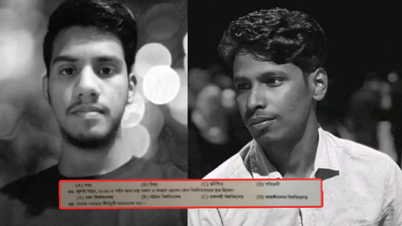 প্রশ্নটি হলো ‘জুলাই বিপ্লব, ২০২৪-এ শহীদ হৃদয় চন্দ্র তরুয়া ও ফরহাদ হোসেন কোন বিশ্ববিদ্যালয়ের ছাত্র ছিলেন?’ চারটি অপশনে ছিল ঢাকা, রাজশাহী, চট্টগ্রাম ও জাহাঙ্গীরনগর।