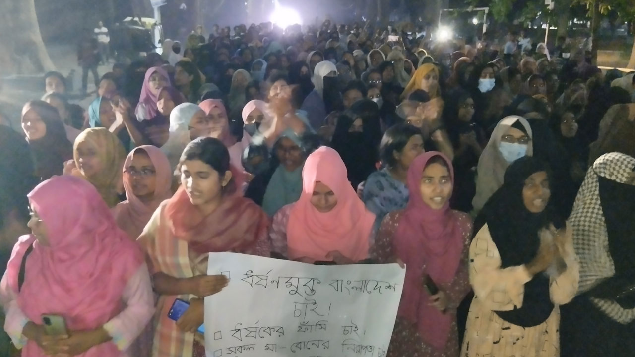এ সময় শিক্ষার্থীরা ‘ফাঁসি ফাঁসি ফাঁসি চাই, ধর্ষকের ফাঁসি চাই’, ‘আমার সোনার বাংলায়, ধর্ষকের ঠাঁই নাই’, ‘ইনকিলাব ইনকিলাব, জিন্দাবাদ জিন্দাবাদ’, ‘আমার বোন ধর্ষিত কেন, ইনটিরিম জবাব চাই’, ‘গোলামি না আজাদি,আজাদি আজাদি’, ‘একটা একটা ধর্ষক ধর, ধইরা ধইরা জবাই কর’ ইত্যাদি স্লোগান দেন।