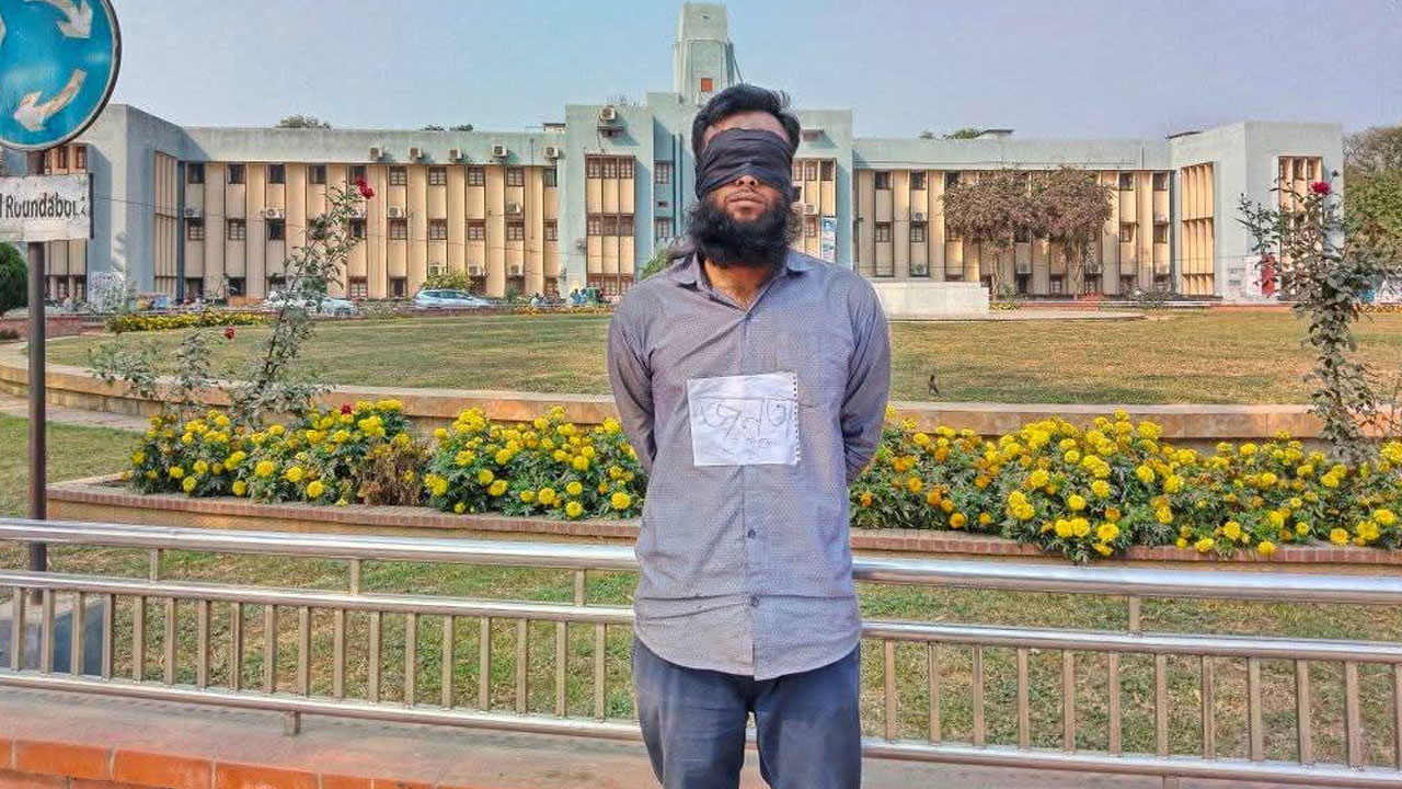 সরেজমিনে দেখা যায়, ওই শিক্ষার্থীর চোখে কালো কাপড় দিয়ে আটকানো। এছাড়াও তার হাত কালো কাপড় দিয়ে বাঁধা। বুকের ওপর সাদা কাগজে লেখা ‘জনতা’, পিঠে লেখা ‘কেন আইনে বাঁধা?’।