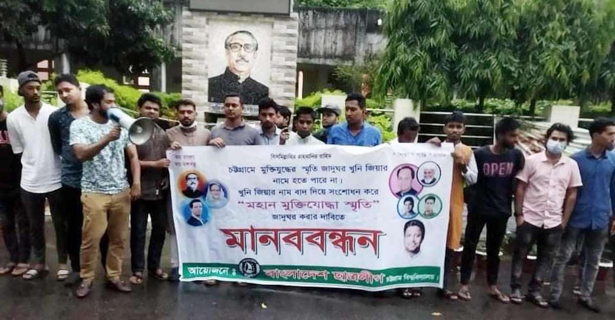 মুক্তিযুদ্ধের স্মৃতি জাদুঘরে জিয়াউর রহমানের নাম বাদ দিয়ে মহান মুক্তিযুদ্ধ স্মৃতি জাদুঘর করার দাবিতে মানববন্ধন করেছে চট্টগ্রাম বিশ্ববিদ্যালয় শাখা ছাত্রলীগ। মঙ্গলবার (১ জুন) দুপুর ২টায় বিশ্ববিদ্যালয়ের বঙ্গবন্ধু চত্বরের সামনে এ মানববন্ধন অনুষ্ঠিত হয়।