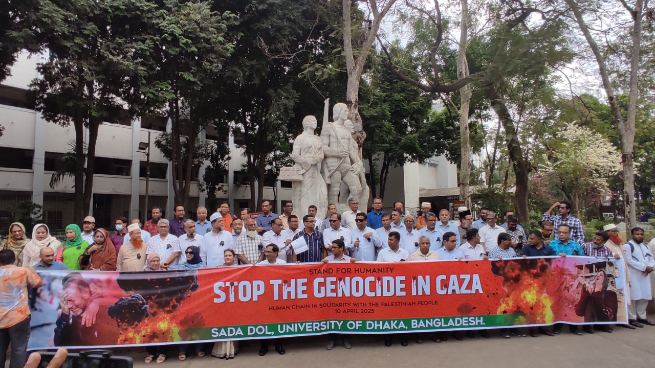কলা অনুষদের ডিন অধ্যাপক ড. ছিদ্দিকুর রহমান খান বলেন, আমরা ঢাকা বিশ্ববিদ্যালয়ের শিক্ষকরা বিবেকের তাড়নায় আজ এখানে দাঁড়িয়েছি। ২০২৩ সালের অক্টোবর মাস থেকে ইসরায়েল গণহত্যা চালিয়ে আসছে, যা ১৮ মাস পেরিয়ে গেছে। গাজা আজ মৃত্যুপুরীতে পরিণত হয়েছে। প্রায় অর্ধলক্ষ মানুষ নিহত হয়েছেন। ইসরায়েল এক ভয়াবহ গণহত্যা চালাচ্ছে, যার পেছনে যুক্তরাষ্ট্রের সরাসরি সমর্থন রয়েছে। আমরা চাই, ওআইসি ও জাতিসংঘ এগিয়ে আসুক। বাংলাদেশ যেন ইসরায়েলের সঙ্গে কোনো ধরনের সম্পর্ক না রাখে, সে দাবি জানাচ্ছি।