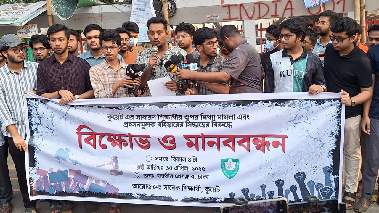 মঙ্গলবার (১৫ এপ্রিল) জাতীয় প্রেস ক্লাবের সামনে ‘সাবেক শিক্ষার্থী, কুয়েট’ ব্যানারে আয়োজিত মানববন্ধন থেকে এ দাবি জানানো হয়।