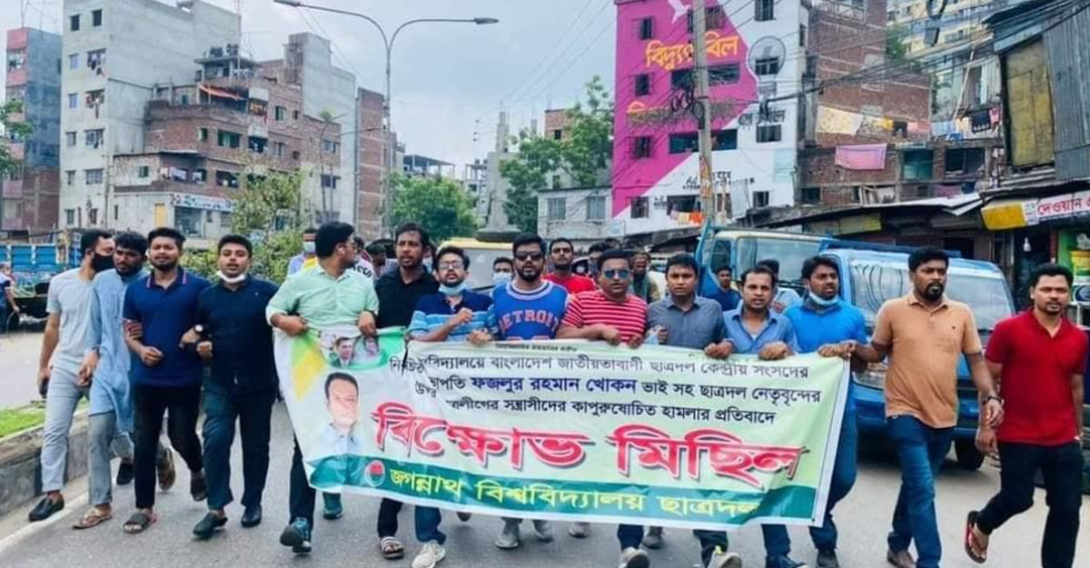 ঢাকা বিশ্ববিদ্যালয় ছাত্রদল কেন্দ্রীয় সংসদের নির্বাচিত সভাপতি ফজলুর রহমান খোকনসহ ছাত্রদলের নেতাদের ওপর ছাত্রলীগের ন্যক্কারজনক হামলার প্রতিবাদে পুরান ঢাকায় বিক্ষোভ মিছিল করে জগন্নাথ বিশ্ববিদ্যালয় ছাত্রদল।